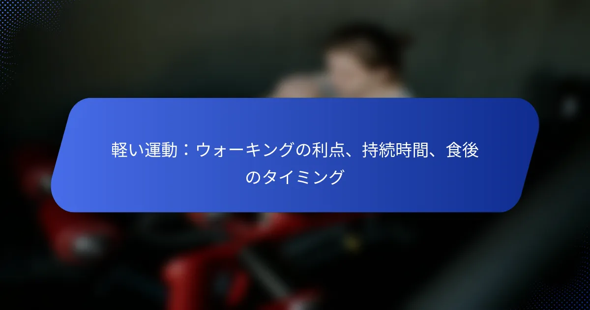 ウォーキングは、心血管の健康改善やメンタルウェルビーイングの向上など、さまざまな健康効果をもたらす効果的な軽い運動です。これらの利点を最大限に引き出すためには、毎週少なくとも150分の中強度のウォーキングを目指し、理想的には食後10〜30分後に始めて消化と代謝をサポートしましょう。 ウォーキングの軽い運動としての健康効果は何ですか? ウォーキングは軽い運動の一形態として、心血管の健康改善、体重管理、メンタルウェルビーイングの向上など、数多くの健康効果を提供します。定期的なウォーキングは、全体的なフィットネスと長寿に大きく寄与し、慢性疾患のリスクを減少させることができます。 心血管の健康改善 定期的なウォーキングは心臓を強化し、その効率を改善し、心臓病のリスクを減少させます。この低衝撃の運動は血圧やコレステロール値を下げ、全体的な心血管の健康を向上させます。 これらの利点を得るためには、毎週少なくとも150分の速歩を行うことが推奨されます。これは、1日30分、週5日など、管理しやすいセッションに分けることができます。 さらに、ウォーキングは血行を促進し、健康的な血流を促すため、時間が経つにつれて心血管の問題を防ぐのに役立ちます。 体重管理とカロリー消費 ウォーキングは体重減少を助け、健康的な体重を維持するための効果的な方法です。カロリーを消費し、体重減少に必要なカロリー不足を作り出します。消費されるカロリーの数は、歩行速度、時間、個々の体重などの要因によって異なります。 平均して、1マイル歩くことで約100カロリーを消費できます。階段を使ったり、休憩中に歩いたりするなど、日常生活にウォーキングを取り入れることで、時間をかけてかなりのカロリー消費につながります。 最適な体重管理のためには、ほとんどの日に30分以上のウォーキングを目指し、フィットネスが向上するにつれて強度や時間を徐々に増やしていきましょう。 メンタルウェルビーイングとストレス軽減 ウォーキングは、エンドルフィンという体内の自然な気分を良くするホルモンを放出することで、メンタルの明晰さを高め、気分を向上させることが示されています。このシンプルな活動は、ストレスレベルを減少させ、不安や抑うつの症状を軽減するのに役立ちます。 屋外でのウォーキングは、自然に触れることでメンタルヘルスの改善にさらに寄与します。心に良い影響を最大限に引き出すために、快適な環境での毎日のウォーキングを目指しましょう。 特に食後にウォーキングを取り入れることで、心を落ち着ける効果が得られ、思考をクリアにするのに役立ちます。これはメンタルウェルビーイングにとって優れた習慣です。 筋力と持久力の向上 ウォーキングは、特に脚やコアのさまざまな筋肉群を使い、これらの部位を強化し、引き締めるのに役立ちます。定期的なウォーキングは、筋肉の持久力を向上させ、日常の活動をより楽に、疲れにくくします。 筋力をさらに向上させるためには、速歩や坂道ウォーキングのインターバルをルーチンに取り入れることを検討してください。この変化は、より挑戦的なワークアウトを提供し、筋肉の成長を刺激します。 さらに、正しい姿勢とテクニックでウォーキングを行うことで、効果的に筋肉を使い、利点を最大化できます。 長寿と全体的なフィットネスへの影響 定期的なウォーキングは、長寿の向上や糖尿病、心臓病、特定のがんなどの慢性疾患のリスク低下と関連しています。研究によると、中程度のウォーキングでも大きな健康改善と長寿につながる可能性があります。 これらの利点を享受するためには、毎週少なくとも150分の中強度のウォーキングを目指しましょう。これは、個々のフィットネスレベルや目標に応じて調整できます。 ウォーキングをライフスタイルに取り入れることで、身体的なフィットネスを向上させるだけでなく、全体的に健康でアクティブな生活に寄与します。 健康効果を得るためにはどのくらい歩くべきですか? ウォーキングから健康効果を得るためには、毎週少なくとも150分の中強度のウォーキングを目指しましょう。これは、1日約30分、週5日で、全体的な健康とウェルビーイングを大幅に向上させることができます。 推奨される1日のウォーキング時間 1日のウォーキング時間の一般的な推奨は約30分です。必要に応じて、1日を通して3回の10分のウォーキングなど、短いセッションに分けることができます。短時間のウォーキングでも、健康に良い影響を与えることができます。 ウォーキングを始めたばかりの方は、10〜15分のウォーキングでも効果があります。ウォーキングの時間を徐々に増やすことで、心血管のフィットネスや全体的な持久力を向上させることができます。 最適な健康のための週ごとのウォーキング目標 最適な健康のためには、毎週150〜300分の中強度のウォーキングを目指しましょう。これは、フィットネスレベ