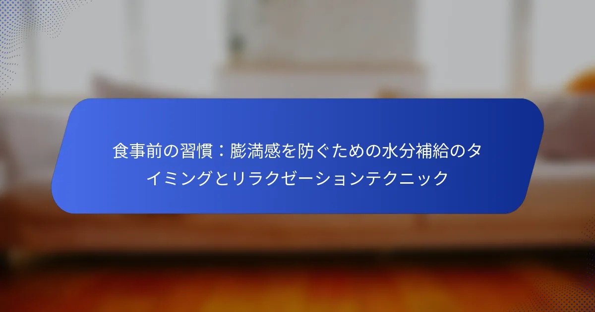 膨満感を効果的に防ぐためには、適切な水分補給のタイミングやリラクゼーション技術など、特定の食事前の習慣を取り入れることが重要です。適切な間隔で水を飲み、ストレスを軽減する活動に参加することで、消化を促進し、食事に関連する不快感を最小限に抑えることができます。これらの戦略は、消化器の健康を促進するだけでなく、全体的な健康にも寄与します。 膨満感を防ぐための主要な食事前の習慣は何ですか? 膨満感を防ぐための主要な食事前の習慣には、適切な水分補給のタイミング、リラクゼーション技術、マインドフルな食事のタイミングが含まれます。これらの戦略を実施することで、消化を促進し、膨満感に関連する不快感を軽減できます。 水分補給のタイミングと消化への影響を理解する 水分補給のタイミングは、最適な消化にとって重要です。食事の約30分前に水を飲むことで、消化器系を準備し、栄養素の吸収を改善し、膨満感の可能性を減らすことができます。 最適な水分摂取量は個人によって異なりますが、食事の前に約8オンス(約240ml)を目指すことが実用的なガイドラインです。この量は、胃酸を過度に希釈することなく消化酵素を刺激するのに役立ちます。 ただし、食事中に大量の水を飲むことは避けてください。これは満腹感を引き起こし、消化を妨げる可能性があります。代わりに、消化プロセスを圧倒することなく水分を維持するために、適度に水を飲むようにしましょう。 消化器の健康を改善するためのリラクゼーション技術を探る リラクゼーション技術は、ストレスレベルを低下させることで消化器の健康を大幅に改善できます。食事の前に深呼吸、瞑想、または穏やかなヨガなどの実践を行うことで、消化に密接に関連する神経系を落ち着かせることができます。 これらの技術に5〜10分間取り組むことで、消化に適した環境を作ることができます。このリラクゼーションの時間は、体が食べ物を処理することに集中できるようにし、ストレスの高い状態にいるのではなくなります。 ゆっくり噛んで一口一口を味わうなどのマインドフルな食事の習慣を取り入れることで、消化をさらに改善できます。このアプローチは、膨満感を軽減するだけでなく、食べ物との健康的な関係を促進します。 ストレスと膨満感の関係を特定する ストレスは消化に直接影響を与え、膨満感を引き起こす可能性があります。ストレスを感じると、体は消化プロセスを遅くするホルモンを放出し、不快感やガスの蓄積を引き起こすことがあります。 ストレスの引き金を認識し、マインドフルネスや身体活動などの技術を通じて管理することで、これらの影響を軽減できます。たとえば、短い散歩やストレッチを行うことで、緊張を和らげ、消化を促進することができます。 感情状態が食習慣にどのように影響するかを意識することが重要です。急いで食べたり、不安な状態で食べたりすると、空気を飲み込んだり、過食したりすることがあり、これらは膨満感の一般的な原因です。 消化における食事のタイミングの役割を認識する 食事のタイミングは消化に重要な役割を果たし、膨満感に影響を与えることがあります。定期的な間隔で食事をすることで、安定した消化リズムを維持し、不快感を防ぐことができます。 食事は約3〜4時間の間隔を空けて摂ることを目指し、体が各食事を消化するのに十分な時間を与えましょう。この習慣は、満腹感や膨満感を最小限に抑えるのに役立ちます。 さらに、最後の食事のタイミングも考慮してください。就寝前に食べすぎると、夜間の消化が悪くなり、翌日に膨満感を引き起こす可能性があります。就寝の2〜3時間前には食事を終えることが望ましいです。 食事前の習慣の効果を評価する 食事前の習慣の効果を評価するには、水分補給、リラクゼーション、食事のタイミングに対する体の反応を観察することが含まれます。食事日記をつけることで、膨満感に関連するパターンや引き金を特定するのに役立ちます。 異なる水分補給のタイミングやリラクゼーション技術が消化にどのように影響するかを記録してください。時間が経つにつれて、どの習慣が消化器の健康に最も良い結果をもたらすかについての洞察を得ることができます。 個々の反応は異なることを忘れないでください。ある人に効果的なことが別の人には効果がない場合もあるため、最適な結果を得るために、必要に応じて習慣を調整することに忍耐強く取り組んでください。 水分補給のタイミングは膨満感にどのように影響しますか? 水分補給のタイミングは、膨満感を防ぐ上で重要な役割を果たします。適切なタイミングで水を飲むことで、消化を促進し、食後の不快感の可能性を減らすことができます。 食事前の水を飲む最適なタイミング 膨満感を最小限に抑えるためには、一般的に食事の約30分前に水を飲むことが推奨されます。これにより、体は水を吸収し、食事中に消化酵素を