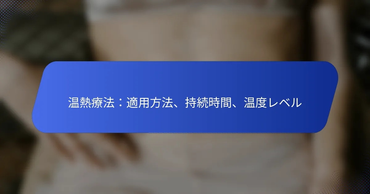 温熱療法は、痛みや不快感を和らげるための効果的な手段であり、タオル、加熱パッド、または湯たんぽなど、さまざまな方法で適用できます。通常、快適さを確保し、皮膚の損傷を防ぐために、100°Fから110°F(38°Cから43°C)の安全な温度で15分から20分間適用する必要があります。 温熱療法の適用方法は何ですか? 温熱療法は、さまざまな方法で適用でき、それぞれ異なるニーズや快適さに応じています。一般的な技術には、タオル、加熱パッド、または湯たんぽを使用することが含まれ、これらはすべて痛みや不快感を和らげるための心地よい熱を提供します。 タオルを温熱療法として使用する タオルを使って温熱療法を作成するには、まず清潔なタオルを熱湯に浸します。液体が垂れないように余分な水分を絞り、扱いやすいサイズに折ります。この方法は一般的な使用に効果的で、温度を簡単に調整できます。 さらに快適さを加えるために、タオルを小さな加熱パッドの周りに巻くか、数秒間電子レンジで加熱することを検討してください。やけどを避けるために、熱が快適であることを確認し、必要に応じて再度浸したり加熱したりして温かさを維持します。 特定の部位に加熱パッドを適用する 加熱パッドは、体の特定の部位に一貫した温かさを提供する便利なオプションです。ほとんどの加熱パッドには調整可能な設定があり、快適な温度を選択できます。過熱を避けるために、低い設定から始めて徐々に上げていきます。 加熱パッドを使用する際は、パッドと肌の間に薄い布を置いて直接接触を防ぎ、やけどを避けます。適用時間は約15〜30分に制限し、使用の合間に肌を冷やす時間を設けます。 湯たんぽを効果的に利用する 湯たんぽは、熱を適用するためのもう一つの効果的な方法です。湯たんぽに熱いが沸騰していない水を入れ、漏れを防ぐためにしっかりと蓋を閉じます。快適に扱えるようにタオルや布で包み、肌を保護します。 湯たんぽは、他の方法に比べて長時間熱を保持できるため、長時間の使用に理想的です。痛みを和らげる必要がある部位に湯たんぽを置き、定期的に温度を確認して安全を確保してください。 温熱療法を作成するための代替方法 従来の方法が利用できない場合は、電子レンジで加熱できる米袋を使用するなどの代替手段を検討してください。清潔な靴下や布袋に生の米を詰め、結び目を作り、電子レンジで短時間加熱して温かくします。この方法は再利用可能で、体の輪郭に簡単にフィットします。 別のオプションは、温かく湿ったスポンジや布を使用することです。スポンジを濡らし、数秒間電子レンジで加熱して、影響を受けた部位に適用します。この方法は迅速で、家庭にあるアイテムで簡単に行えます。 温熱療法を適用するのに最適な体の部位 温熱療法は、特に筋肉の緊張や痛みを感じる部位、例えば首、肩、腰に効果的です。また、腹部の不快感、生理痛、鼻腔の圧迫にも有益です。 温熱療法を適用する際は、対象部位が清潔で、開放的な傷がないことを確認してください。これにより、効果を最大限に引き出し、刺激や感染のリスクを最小限に抑えることができます。 温熱療法を使用する際の注意事項 温熱療法は一般的に安全ですが、いくつかの注意事項を守ることが重要です。やけどを防ぐために、肌に適用する前に温度を必ずテストしてください。敏感肌や糖尿病などの状態がある場合は、使用前に医療専門家に相談してください。 過熱を避けるために適用時間を制限し、肌を冷やすための休憩を取ります。もし不快感や異常反応があれば、直ちに使用を中止し、必要に応じて医療のアドバイスを求めてください。 温熱療法はどのくらいの時間適用すべきですか? 温熱療法は通常、1回あたり約15〜20分間適用する必要があります。この時間は、不快感を効果的に和らげる一方で、皮膚の損傷ややけどのリスクを最小限に抑えるのに役立ちます。個々の感受性や治療する特定の状態に応じて調整が必要な場合があります。 筋肉の緊張を和らげるための推奨時間 筋肉の緊張を和らげるためには、温熱療法を15〜30分間適用することが有益です。この時間は、熱が筋肉組織に浸透し、血流を増加させ、影響を受けた部位のリラクゼーションを促進します。過熱を防ぐために、適用の合間に休憩を取ることをお勧めします。 特に、緊張を悪化させる可能性のある身体活動の後には、温熱療法を1日数回使用することを検討してください。不快感が続く場合は、医療専門家に相談してさらなる評価を受けてください。 生理痛に対する最適な適用時間 生理痛に対処する際は、温熱療法を20〜30分間適用することができます。これにより、腹部の筋肉がリラックスし、血流が増加することで痛みが和らぎます。多くの人が、ピーク時の痛みを和らげるために温熱療法を使用しています。 1日の間に数時間ごとに温熱療法を再適用することで、快適さを高めることができます。自分の体の